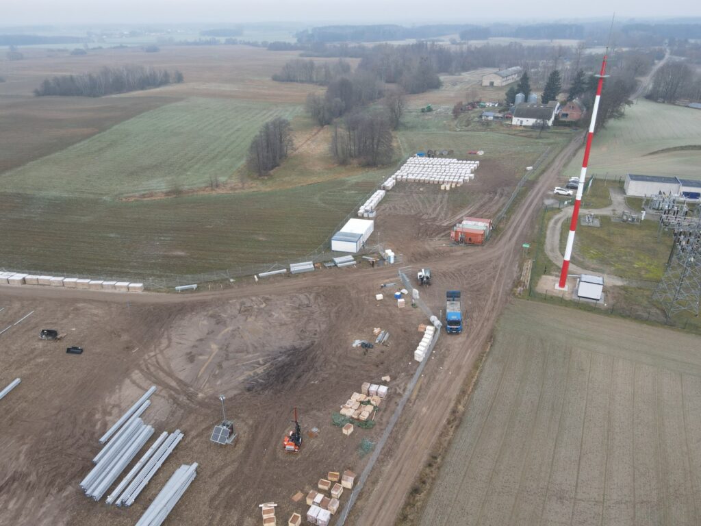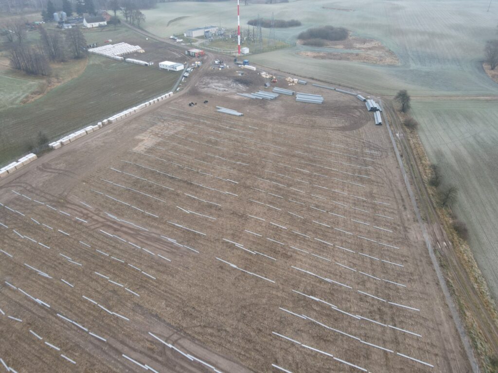 Zakończono przygotowanie terenu oraz wykonanie dróg wewnętrznych, które zapewniają sprawną logistykę i bezpieczny dojazd dla ekip montażowych. Równolegle rozpoczęto montaż konstrukcji wsporczych pod panele fotowoltaiczne — to pierwszy widoczny element przyszłej instalacji, który wyznacza tempo dalszych działań.